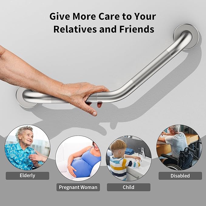 - 135 Degree Angled Safety Grab Bars Versatile Use: This wall-mount handicap grab bar is versatile and suitable for a wide range of applications. Whether it's the bathroom, kitchen, stairways, or the laundry room,brushed nickel shower grab bar offers additional fall prevention. It's perfect for elderly individuals, kids, those with injuries, and even pregnant women.