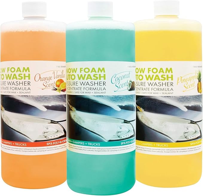 - [DETERGENT TRIO]: Includes a 3-pack of Sun Joe's Snow Foam Auto Wash in scents pineapple, coconut, and orange-vanilla